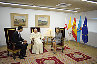 Questi apporti e iniziative della vostra lunga storia, e anche di oggi, insieme al significato di questi due luoghi della vostra bella geografia che visiterò in questa occasione, mi spronano ad allargare il mio pensiero a tutti i popoli di Spagna e d'Europa. Come il Servo di Dio Giovanni Paolo ii, che da Compostela esortò il Vecchio Continente a dare nuovo vigore alle sue radici cristiane, anch'io vorrei esortare la Spagna e l'Europa a edificare il loro presente e a progettare il loro futuro a partire dalla verità autentica dell'uomo, dalla libertà che rispetta questa verità e mai la ferisce, e dalla giustizia per tutti, iniziando dai più poveri e derelitti. Una Spagna e un'Europa non solo preoccupate delle necessità materiali degli uomini, ma anche di quelle morali e sociali, di quelle spirituali e religiose, perché tutte queste sono esigenze autentiche dell'unico uomo e solo così si opera in modo efficace, integro e fecondo per il suo bene.