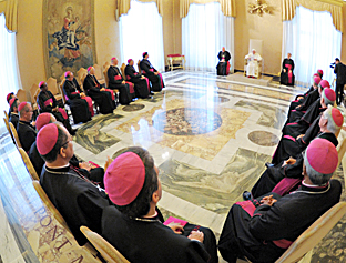 La conferenza episcopale è uno strumento di collegialità al servizio dei vescovi, e di comunione con il Papa. Ma in nessun caso si sostituisce ai singoli pastori. Lo ha ricordato Benedetto XVI ai presuli della regione centro oeste del Brasile, ricevuti lunedì mattina, 15 novembre, in visita "ad limina".
