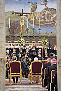 riesce difficile parlare ancora dopo una musica tanto maestosa e profondamente toccante. Ma per quanto povera essa possa essere, ritengo sia opportuna una parola di saluto, di ringraziamento e di riflessione. Vorrei così salutare di cuore tutti Voi qui convenuti nella Cappella Sistina. Innanzitutto sono grato al Signor Presidente Federale e alla sua gentile Consorte perché ci onorano stasera della loro presenza. Caro Signor Presidente Federale, la Sua visita è un vero piacere per me. Con ciò, Ella esprime la vicinanza e l'affetto del Popolo tedesco al Successore di Pietro, che è Suo connazionale. Un sentito Vergelt's Gott ("Dio Vi renda merito") anche per le Sue gentili parole che entrano in profondità, e per il fatto che Ella ha reso possibile questa serata per noi. Parimenti ringrazio di cuore il Domkapellmeister, Signor Reinhard Kammler, gli Augsburger Domsingknaben e la Residenz-Kammerorchester München per la magistrale esecuzione di questo magnifico Oratorio. Grazie per questo meraviglioso dono!
