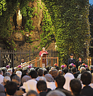 Con grande gioia mi unisco a voi, al termine di questo tradizionale incontro di preghiera, che conclude il mese di Maggio in Vaticano. Con riferimento alla liturgia odierna, vogliamo contemplare Maria Santissima nel mistero della sua Visitazione. Nella Vergine Maria che va a visitare la parente Elisabetta riconosciamo l'esempio più limpido e il significato più vero del nostro cammino di credenti e del cammino della Chiesa stessa. La Chiesa è per sua natura missionaria, è chiamata ad annunciare il Vangelo dappertutto e sempre, a trasmettere la fede ad ogni uomo e donna, e in ogni cultura.