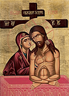 Maria e la Chiesa ai piedi della croce piangono colui che volontariamente è salito su di essa, colui che veramente è Dio e uomo, il Verbo incarnato: "O Vergine tutta immacolata, Madre del Cristo Dio, una spada trapassò la tua anima santissima quando vedesti il tuo Figlio e Dio volontariamente crocifisso. Di fronte alla passione del Figlio, la pura, gemendo dolorosamente, innalzava con grida questo lamento: Come hanno potuto consegnarti al giudizio di Pilato te che incessantemente gli angeli glorificano con inni? Inneggio, o Verbo, alla tua grande e inesprimibile compassione!". I theotòkia insistono sulla morte volontaria di Cristo sulla croce: "La Vergine Madre tua, o Cristo, vedendoti morto, disteso sul legno, nel pianto gridava: Che è, Figlio mio, questo terribile mistero? Come tu che doni la vita eterna a tutti, muori volontariamente in croce?".