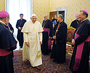 Sono lieto di ricevervi questa mattina, mentre realizzate il vostro pellegrinaggio sulle tombe degli Apostoli Pietro e Paolo, segno eloquente della vostra comunione con il Successore di Pietro. Ringrazio il Presidente della vostra Conferenza episcopale, monsignor Luigi Padovese, Vicario Apostolico d'Anatolia, per le cordiali parole che mi ha rivolto a nome vostro. Attraverso la vostra presenza, sono anche le comunità dai molteplici volti a incontrare la Chiesa di Roma, mostrando così la loro unità profonda. Una volta tornati nel vostro paese, salutate affettuosamente a nome mio i sacerdoti, i religiosi e le religiose e tutti i fedeli delle vostre diocesi. Dite loro che il Papa, nel ricordo sempre presente nel suo cuore del suo pellegrinaggio in Turchia, resta vicino a ognuno di essi, alle loro preoccupazioni e alle loro speranze. La vostra visita, che si svolge provvidenzialmente in questo anno dedicato a san Paolo, assume un'importanza particolare per voi che siete i Pastori della Chiesa cattolica in Turchia, terra in cui è nato l'Apostolo delle Genti e in cui ha fondato numerose comunità. Come ho dichiarato nella Basilica che accoglie la sua tomba, ho voluto indire questo anno paolino "per ascoltarlo e per apprendere ora da lui, quale nostro maestro, "la fede la verità", in cui sono radicate le ragioni dell'unità tra i discepoli di Cristo" (Omelia, Basilica di San Paolo Fuori le Mura, 28 giugno 2008). So che nel vostro paese avete voluto dare un risalto particolare a questo anno giubilare e che molti pellegrini stanno visitando i luoghi cari alla tradizione cristiana. Auspico che l'accesso a questi luoghi significativi per la fede cristiana, come pure la celebrazione del culto, sia sempre più agevole per i pellegrini. Inoltre mi rallegro vivamente della dimensione ecumenica conferita all'anno paolino, mostrando così l'importanza di questa iniziativa per le altre Chiese e comunità cristiane. Possa questo anno permettere nuovi progressi lungo il cammino verso l'unità di tutti i cristiani!