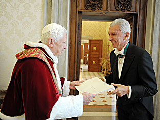 In questa felice circostanza Le porgo, col mio cordiale benvenuto, un fervido augurio per l'impegnativa missione che Ella oggi ufficialmente assume. Infatti, l'Ambasciata d'Italia presso la Santa Sede - la cui prestigiosa sede, legata anche alla memoria di san Carlo Borromeo, ho potuto visitare due anni or sono - costituisce un importante punto di raccordo per i rapporti di intensa collaborazione che intercorrono fra la Santa Sede e l'Italia, non solo dal punto di vista bilaterale, ma anche nel più ampio contesto della vita internazionale. Inoltre, la Rappresentanza diplomatica, di cui Ella assume la guida, offre un valido contributo allo sviluppo di armoniosi rapporti fra la comunità civile e quella ecclesiale nel Paese, e presta pure preziosi servizi al Corpo Diplomatico accreditato presso la Santa Sede. Sono certo che sotto la Sua guida questa intensa attività proseguirà con rinnovato slancio, e già da ora esprimo a Lei e ai Suoi collaboratori la mia viva riconoscenza.