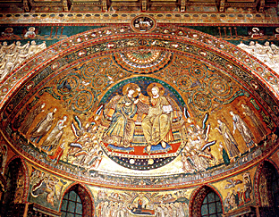 Percorrendo, allora, quella via pulchritudinis che il Servo di Dio Paolo vi indicò come fecondo itinerario di ricerca teologica e mariologica, vorrei notare la profonda sintonia tra il pensiero teologico e mistico, la liturgia, la devozione mariana e le opere d'arte, che, con lo splendore dei colori e delle forme, cantano il mistero dell'Assunzione di Maria e la sua gloria celeste accanto al Figlio. Tra quest'ultime, vi invito ad ammirarne due particolarmente significative in Roma: i mosaici absidali delle basiliche mariane di S. Maria Maggiore e di S. Maria in Trastevere.