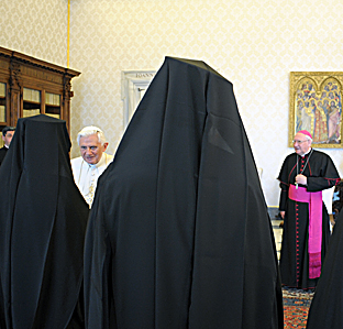 Cari Fratelli in Cristo, "Grazia a voi e pace da Dio, Padre nostro" (Col 1, 2). Con grande gioia e sincero affetto vi accolgo nel Signore, in questa città di Roma, in occasione della celebrazione annuale del martirio dei santi Pietro e Paolo. La loro solennità che la Chiesa cattolica e le Chiese ortodosse celebrano nello stesso giorno, è una delle più antiche dell'anno liturgico e commemora un tempo in cui le nostre comunità vivevano in piena comunione reciproca. La vostra presenza qui, oggi, per la quale sono profondamente grato al Patriarca di Costantinopoli, Sua Santità Bartolomeo I, e al Santo Sinodo del Patriarcato Ecumenico, reca grande gioia nei cuori di tutti noi. Ringrazio il Signore per il fatto che le relazioni fra noi sono caratterizzate da sentimenti di fiducia reciproca, stima e fraternità, come ampiamente attestato dai numerosi incontri che si sono già svolti nel corso dell'anno. Tutto ciò fa sperare che il dialogo cattolico-ortodosso continui a fare progressi significativi. Lei, Eminenza, è consapevole del fatto che la Commissione Mista Internazionale per il Dialogo Teologico, di cui è Segretario congiunto, è a un punto cruciale, avendo cominciato lo scorso ottobre, a Paphos, a discutere del "ruolo del Vescovo di Roma nella Comunione della Chiesa nel primo Millennio". Con tutto il cuore preghiamo affinché, illuminati dallo Spirito Santo, i Membri della Commissione proseguano lungo questo cammino durante la prossima sessione plenaria a Vienna e dedichino a esso il tempo necessario per uno studio accurato di tale delicata e importante questione. Per me è un segno incoraggiante che il Patriarca Ecumenico Bartolomeo I e il Santo Sinodo di Costantinopoli condividano la nostra ferma convinzione dell'importanza di questo dialogo, come Lei, Santità ha affermato con tanta chiarezza nella Lettera Enciclica sinodale e patriarcale in occasione della Domenica Ortodossa, il 21 febbraio 2010. Nella prossima Assemblea Speciale per il Medio Oriente del Sinodo dei Vescovi, che ho convocato per il mese di ottobre, qui a Roma, sono certo che il tema della cooperazione ecumenica fra i cristiani di quella regione riceverà grande attenzione. Di fatto questo è evidenziato nell'Instrumentum laboris, che ho consegnato ai Vescovi cattolici del Medio Oriente durante la mia recente visita a Cipro, dove sono stato accolto con grande calore fraterno da Sua Beatitudine Crisostomo ii, Arcivescovo di Nuova Giustiniana e di tutta Cipro. Le difficoltà che i Cristiani del Medio Oriente vivono sono in gran parte comuni a tutti: essere una minoranza, desiderare libertà religiosa autentica e pace. È necessario il dialogo con le comunità islamica e musulmana. In questo contesto, sarò molto lieto di accogliere la Delegazione Fraterna che il Patriarca ecumenico invierà per partecipare ai lavori dell'Assemblea Sinodale. Eminenza, cari membri della Delegazione, vi ringrazio per questa visita. Vi chiedo di trasmettere i miei saluti fraterni a Sua Santità Bartolomeo i, al Santo Sinodo, al clero e a tutti i fedeli del Patriarcato Ecumenico. Attraverso l'intercessione degli Apostoli Pietro e Paolo, che il Signore ci conceda benedizioni abbondanti e ci conservi sempre nel suo amore.(©L'Osservatore Romano - 28-29 giugno 2010)