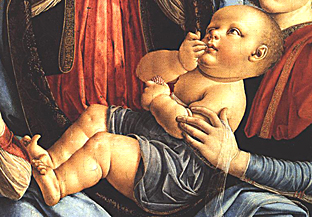 Un artista che l'ha ben rappresentato è certamente Sandro Botticelli ad esempio nell'opera Madonna con Bambino e angeli, ma vi sono precedenti più antichi. Intorno agli anni 1320-1330, i fratelli Lorenzetti, Ambrogio nella Madonna del latte del Seminario di Siena e anche Pietro nel polittico dell'altare maggiore della Pieve di Arezzo, raffigurano il Gesù Bambino vestito di una tunichetta ma con le gambe nude e gli alluci dei piedini in estensione.