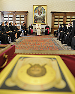 Sono lieto di poter porgere un cordiale benvenuto a ciascuno di voi, onorevoli Membri della Delegazione Ufficiale, venuti a Roma nella felice circostanza della memoria liturgica dei Santi Cirillo e Metodio. La vostra presenza, che testimonia le radici cristiane del Popolo bulgaro, offre l'occasione propizia per confermare la mia stima verso codesta cara Nazione e ci permette di rinsaldare la nostra amicizia, avvalorata dalla devozione per i due santi Fratelli di Tessalonica.