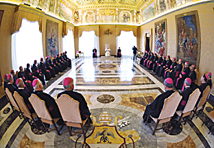 Vedo che amate profondamente le vostre diocesi e anch'io partecipo intimamente a questo vostro amore, accompagnandovi con la preghiera e la cura apostolica. La nostra è una bella storia con un inizio tangibile nelle Bolle emanate dal Successore di Pietro per l'ordinamento episcopale e in quel "eccomi qui" proferito da ciascuno all'inizio della cerimonia della sua consacrazione e conseguente ingresso nel Collegio dei Vescovi. Di esso cominciate a far parte "in virtù della consacrazione episcopale e della comunione gerarchica con la Testa e le Membra" ( Nota Esplicativa Previa, allegata alla Const. Dogm. Lumen gentium), diventando successori degli Apostoli con la triplice funzione di insegnare, santificare e governare il popolo di Dio.