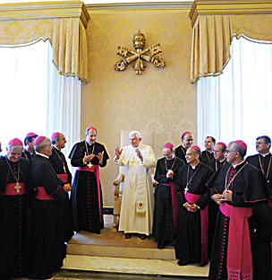 Vejo que amais profundamente as vossas dioceses e também eu participo intimamente deste vosso amor, acompanhando-vos com a oração e a solicitude apostólica. A nossa é uma bela história com início palpável nas Bulas expedidas pelo Sucessor de Pedro para a ordenação episcopal e naquele "Eis-me aqui" proferido por cada um no início da cerimônia da sua sagração e consequente ingresso no Colégio dos Bispos. Dele começastes a fazer parte "em virtude da sagração episcopal e pela comunhão hierárquica com a Cabeça e com os membros" (Nota Explicativa Prévia, anexa à Const. dogm. Lumen gentium), tornando-vos sucessores dos Apóstolos com a tríplice função de ensinar, santificar e governar o povo de Deus. Enquanto mestres e doutores da fé, tendes a missão de ensinar com audácia a verdade que se deve crer e viver, apresentando-a de forma autêntica. Como vos disse em Aparecida, "a Igreja tem a grande tarefa de conservar e alimentar a fé do povo de Deus, e recordar também aos fiéis (...) que, em virtude do seu batismo, são chamados a ser discípulos e missionários de Jesus Cristo" (Discurso inaugural da v Conferência Geral do Episcopado Latino-Americano e do Caribe, 13/5/2007, 3). Ajudai, pois, os fiéis confiados aos vossos cuidados pastorais a descobrirem a alegria da fé, a alegria de serem pessoalmente amados por Deus, que entregou o seu Filho para nossa salvação. Como bem sabeis, crer consiste sobretudo em abandonar-se a este Deus que nos conhece e ama pessoalmente, aceitando a Verdade que Ele revelou em Jesus Cristo com a atitude que nos leva a ter confiança nele como revelador do Pai. Queridos irmãos, tende grande confiança na graça e sabei infundir esta confiança no vosso povo, para que a fé sempre seja guardada, defendida e transmitida na sua pureza e integridade.