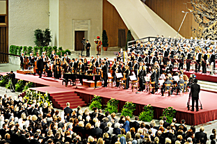 Ed ora una breve riflessione sulla musica che abbiamo ascoltato: una sinfonia di Haydn, del gruppo delle "Londinesi", detta "La sorpresa", o "mit dem Paukenschlag" per il caratteristico uso del timpano nel secondo tempo; la Fantasia corale di Beethoven, un brano abbastanza atipico come genere nel panorama beethoveniano, ma che mostra sinteticamente le possibilità espressive della musica solistica, orchestrale e corale; e, collocata in mezzo, la Cecilia, vergine romana di Arvo Pärt. Le due opere di Haydn e di Beethoven hanno fatto risuonare tutta la ricchezza e la potenza della musica sinfonica del periodo classico e romantico: con essa il genio umano gareggia in creatività con la natura, dà vita ad armonie varie e multiformi, dove anche la voce umana partecipa di questo linguaggio, che è come un riflesso della grande sinfonia cosmica. Tale forma è caratteristica soprattutto del periodo romantico e tardo romantico, ma va oltre, rappresenta una dimensione universale dell'arte, un modo di concepire l'uomo e il suo posto nel mondo.