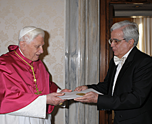 Benedetto XVI ha ricevuto nella mattina di venerdì 10 dicembre, alle ore 11.30, in solenne udienza, Sua Eccellenza il Signor Eduardo Delgado Bermúdez, nuovo Ambasciatore di Cuba presso la Santa Sede, il quale ha presentato le Lettere con le quali viene accreditato nell'alto ufficio. L'Ambasciatore, rilevato alla sua residenza da un Gentiluomo di Sua Santità e da un Addetto di Anticamera, è giunto alle 11.15 al Cortile di San Damaso, nel Palazzo Apostolico Vaticano, ove un reparto della Guardia Svizzera Pontificia rendeva gli onori. Al ripiano degli ascensori, era ricevuto da un Gentiluomo di Sua Santità e subito dopo saliva alla seconda Loggia, dove si trovavano ad attenderlo gli Addetti di Anticamera e i Sediari. Dalla seconda Loggia il corteo si dirigeva alla Sala Clementina, dove il rappresentante diplomatico veniva ricevuto dal prefetto della Casa Pontificia, arcivescovo James Michael Harvey, il quale lo introduceva alla presenza del Pontefice nella Biblioteca privata. Dopo la presentazione $\delle Credenziali da parte dell'Ambasciatore avevano luogo lo scambio dei discorsi e, quindi, il colloquio privato. Successivamente, nella Sala Clementina l'Ambasciatore prendeva congedo dal prefetto della Casa Pontificia e si recava a far visita al cardinale Tarcisio Bertone, segretario di Stato. Al termine del colloquio l'Ambasciatore discendeva nel Cortile di San Damaso, dove si congedava dai dignitari che lo avevano accompagnato e faceva ritorno alla sua residenza. Questo è il testo del discorso del Papa.