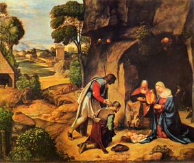 In quest'opera paesaggio e figure insieme esprimono un'armonia quasi musicale. L'interiorità meditativa dei personaggi che, silenziosi, contemplano il neonato Gesù viene sottolineata dalla loro sistemazione intorno al bambino in un cerchio davanti all'arco semicircolare della grotta:  il cerchio è una forma chiusa che torna su se stessa. Giorgione equilibra l'arco della grotta, sul piano, con il gruppo di persone sistemato in profondità, per dare precise coordinate di una lettura formale - piano e profondità - che egli poi sviluppa nel paesaggio, giustapponendo elementi naturali che conducono l'occhio verso le montagne, con altri, architettonici, che ristabiliscono il piano pittorico.