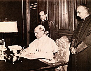 Alla fine dell'ottobre 1939, a due mesi dallo scoppio della guerra europea, Pio XII pubblicava l'enciclica Summi Pontificatus, la prima dopo la sua elezione. Si trattava di un testo assai complesso, che allora finì inevitabilmente per essere letto alla luce delle drammatiche vicende di quelle settimane: da molti circoli occidentali fu giudicata come una decisa presa di posizione in senso anti-nazista e filo-polacco, "forse, per certi versi, il documento più importante che la guerra abbia finora prodotto", come si affermò negli ambienti del Foreign Office. Fra l'altro, il Papa vi rinnovava la condanna della "concezione, che assegna allo Stato un'autorità illimitata", sottolineando come essa non costituisse solo "un errore pernicioso alla vita interna delle nazioni, (...) ma arreca(sse) altresì nocumento alle relazioni fra i popoli, perché rompe l'unità della società soprannazionale, toglie fondamento e valore al diritto delle genti, apre la via alla violazione dei diritti altrui e rende difficile l'intesa e la convivenza pacifica": sottolineava insomma il rapporto fra totalitarismo e politica di guerra.