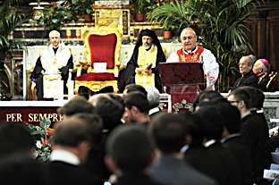 Una "lezione" viene da Oriente. E dai sacerdoti delle Chiese cattoliche orientali. Quella di recuperare, attraverso il particolare culto reso allo Spirito Santo, il rapporto tra liturgia e vita. Rapporto segnato anche dall'accoglienza della Parola "stagionata dal silenzio" e dalla riaffermazione dell'importanza dell'omelia, quale "estensione del catecumenato". È quanto ha messo in evidenza il cardinale prefetto della Congregazione per le Chiese Orientali, Leonardo Sandri, che, nel pomeriggio di giovedì 10, nella chiesa di Santo Spirito in Sassia, ha presieduto un incontro di preghiera che ha preceduto e si è unito quasi senza soluzione di continuità con la grande veglia in piazza San Pietro con Benedetto XVI.