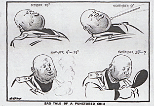 Andando a vedere le opere si nota subito una serie di disegni satirici sbeffeggianti  il duce e il regime datati tra il 1940 e il 1943,  tutti  realizzati  da illustratori  inglesi  su riviste  come  "Punch".  Inoltre c'è persino Merlyn Evans, pittore inglese di stanza in Italia nell'aprile del 1945, testimone degli orrori di piazzale Loreto. E già con questi autori andiamo fuori dal tema indicato dal titolo della mostra; poiché ci risulta piuttosto difficile credere che quelle vignette circolassero nell'autarchica Italia di quegli anni.