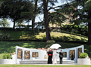 È per me motivo di gioia inaugurare questa fontana nei Giardini Vaticani, in un contesto naturale di singolare bellezza. È un'opera che va ad incrementare il patrimonio artistico di questo incantevole spazio verde della Città del Vaticano, ricco di testimonianze storico-artistiche di varie epoche. Infatti, non solo i prati, i fiori, le piante, gli alberi, ma anche le torri, le casine, i tempietti, le fontane, le statue e le altre costruzioni fanno di questi Giardini un unicum affascinante. Essi sono stati per i miei Predecessori, e sono anche per me uno spazio vitale, un luogo che volentieri frequento per trascorrere un po' di tempo in preghiera e in serena distensione.